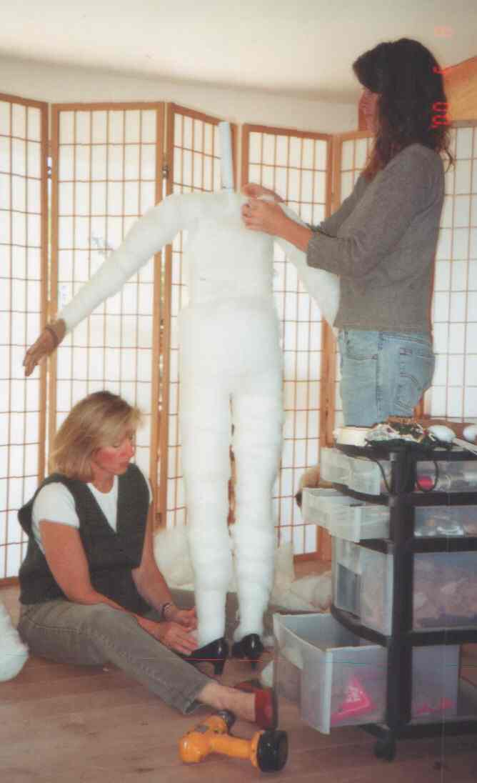 The completed frame is wrapped with strips of polyester batting shaping the human form. The completed form is then covered with two layers of strong flesh colored nylon and sprayed with Scotchguard. The sculptures are made of synthetic materials so no worries about mildew or bugs.